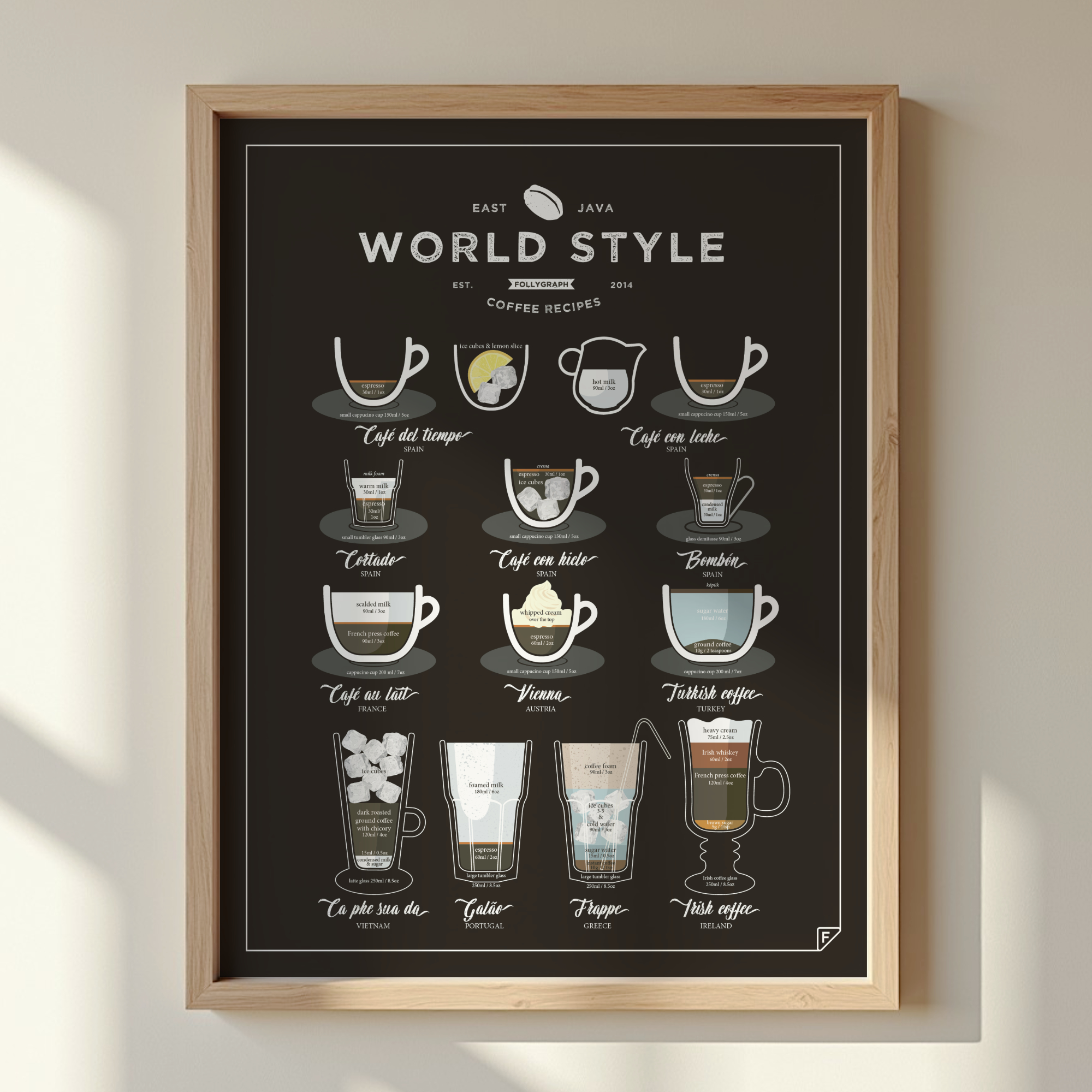 Plakat „World Style Coffee” przedstawia 12 przepisów na znakomitą kawę z różnych zakątków świata. Znajdziesz tu zarówno irlandzką kawę i francuską Café au Lait, jak i mniej znane, lecz równie pyszne i pobudzające, hiszpańską Café del Tiempo oraz portugalski klasyk Galão.